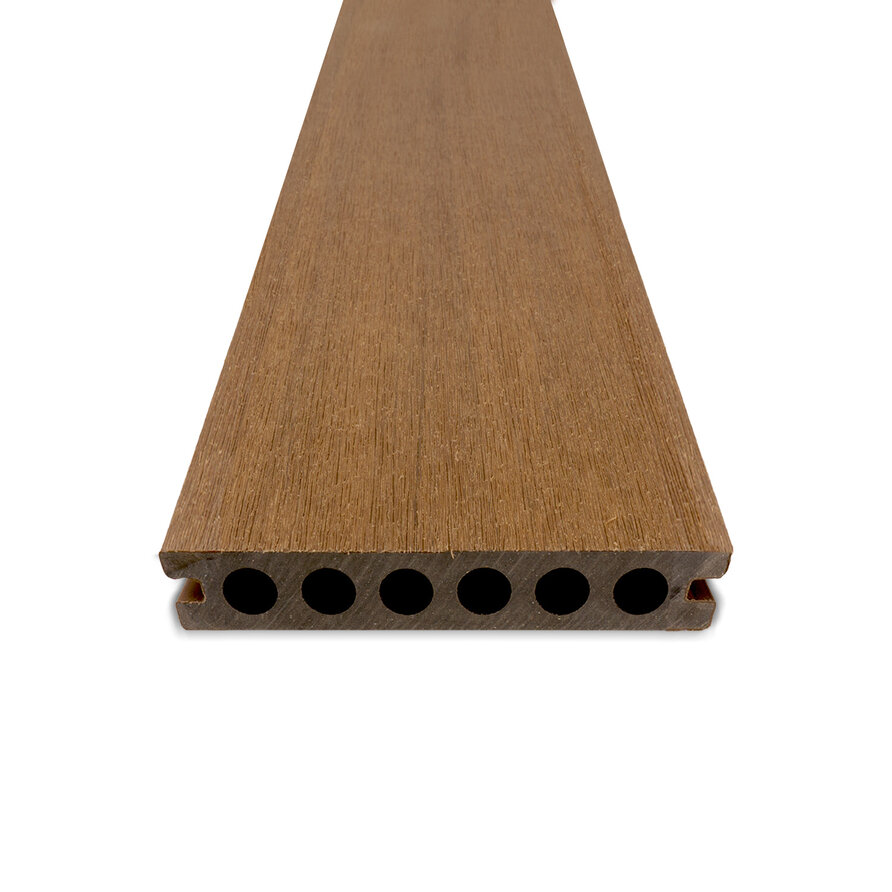 Composiet vlonderplank - hol (niet massief) - teak look - 23x138 mm - 1 zijde geschaafd / 1 zijde geborsteld (optiek) - terrasplank met blinde bevestiging - houtcomposiet
