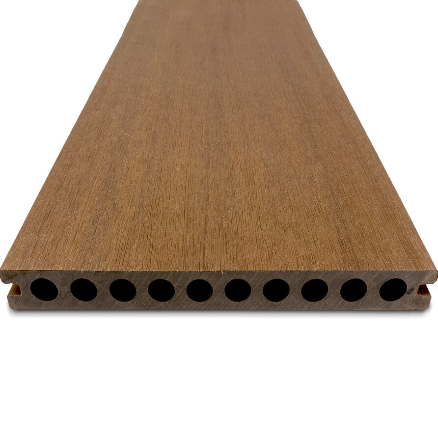 Composiet vlonderplank - hol (niet massief) - teak look - 23x210 mm - 1 zijde geschaafd / 1 zijde geborsteld (optiek) - terrasplank met blinde bevestiging - houtcomposiet