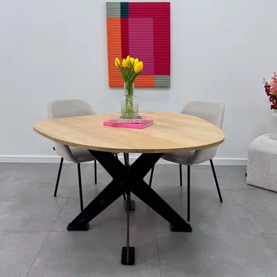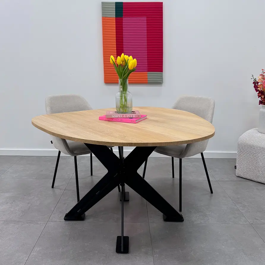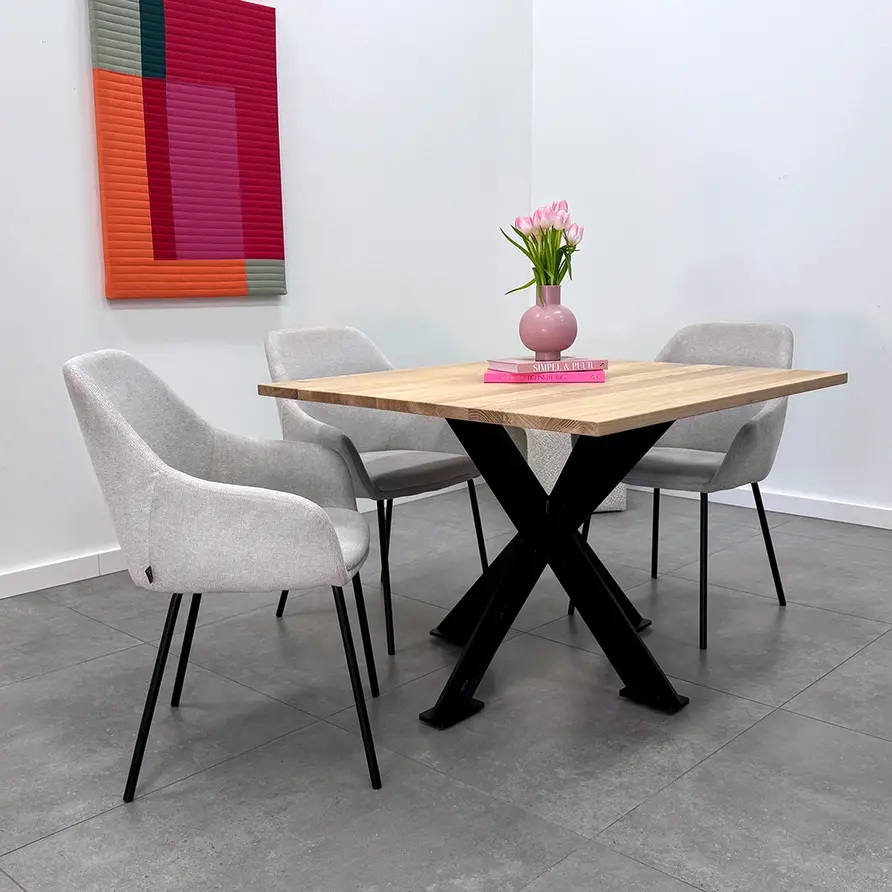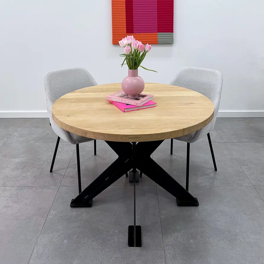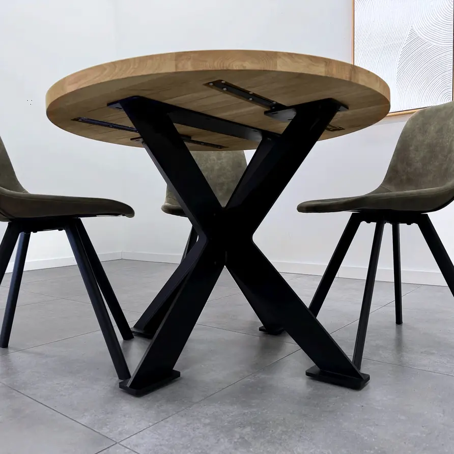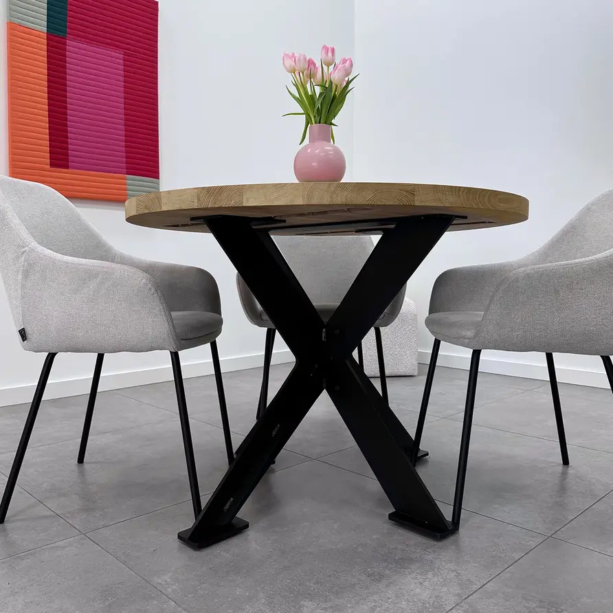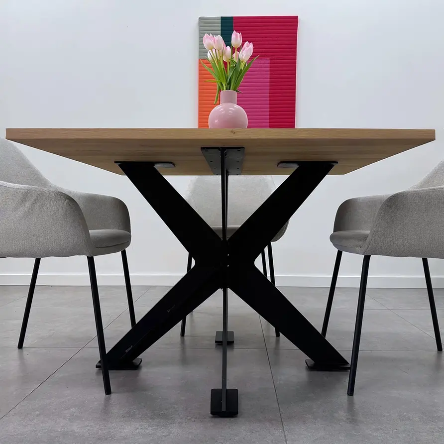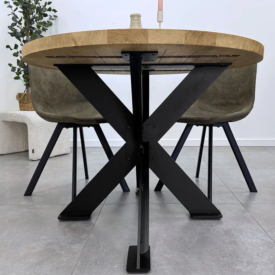 GESCHIKT VOOR: Dit onderstel is geschikt voor een vierkant / rond tafel(blad) met een diameter van circa 95 cm tot 130 cm. Daarnaast adviseren wij een minimale tafelblad dikte van 3-4 cm, zeker in het geval van de wat grotere tafels. De kans op "kromtrekken' is bij een (eiken) tafelblad van 2-3 cm relatief groot, ook al is uw tafelblad voorzien van staalprofielen t.b.v. stabilisatie.