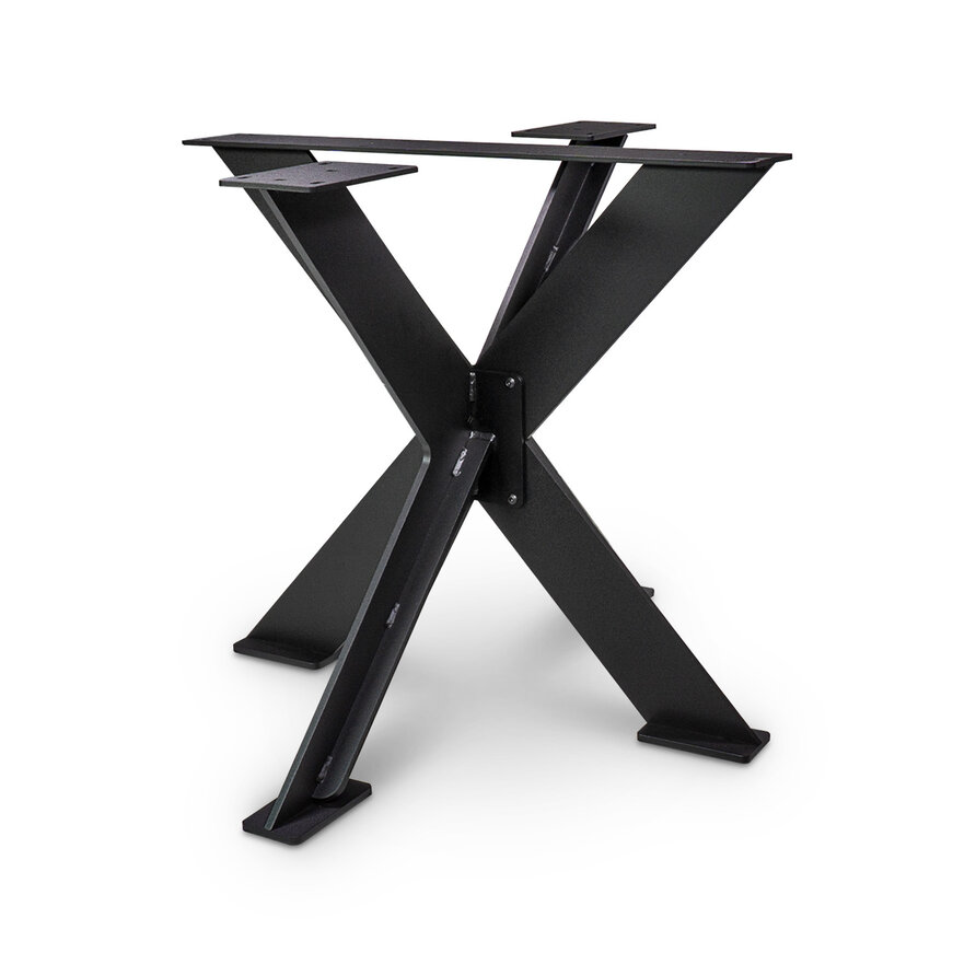 Een zwart dubbel X tafel onderstel van metaal - met een dikte van 1 cm massief staal, een hoogte van 72 cm, een afmeting van 78x90 cm - die met de hand wordt vervaardigd. Dit metalen tafelonderstel is ideaal voor vierkante & ronde tafelbladen. Het massieve 1 cm dikke staal geeft de poot een stijlvol en strak uiterlijk met en extra luxueus accent.