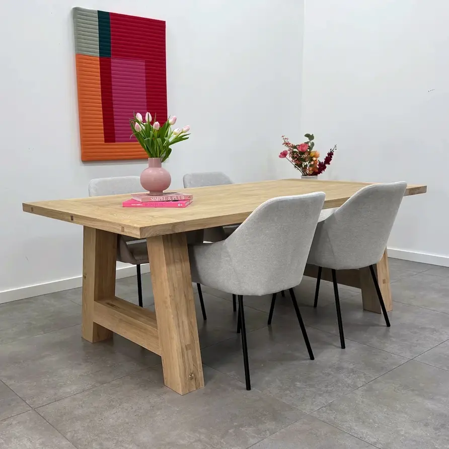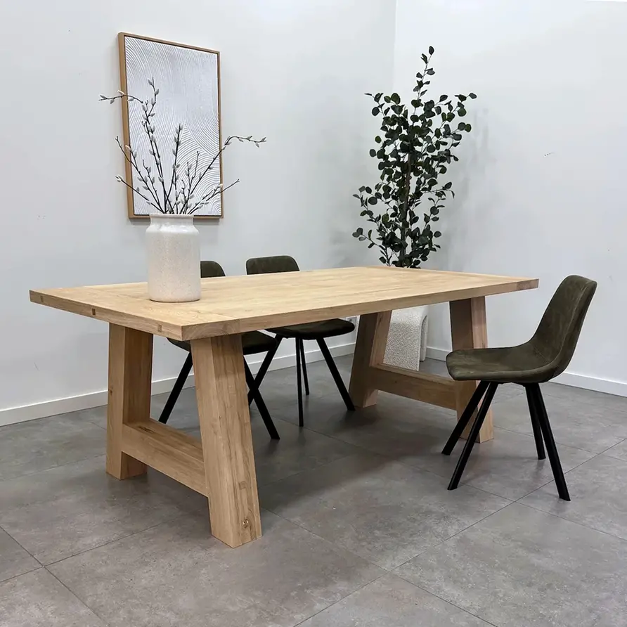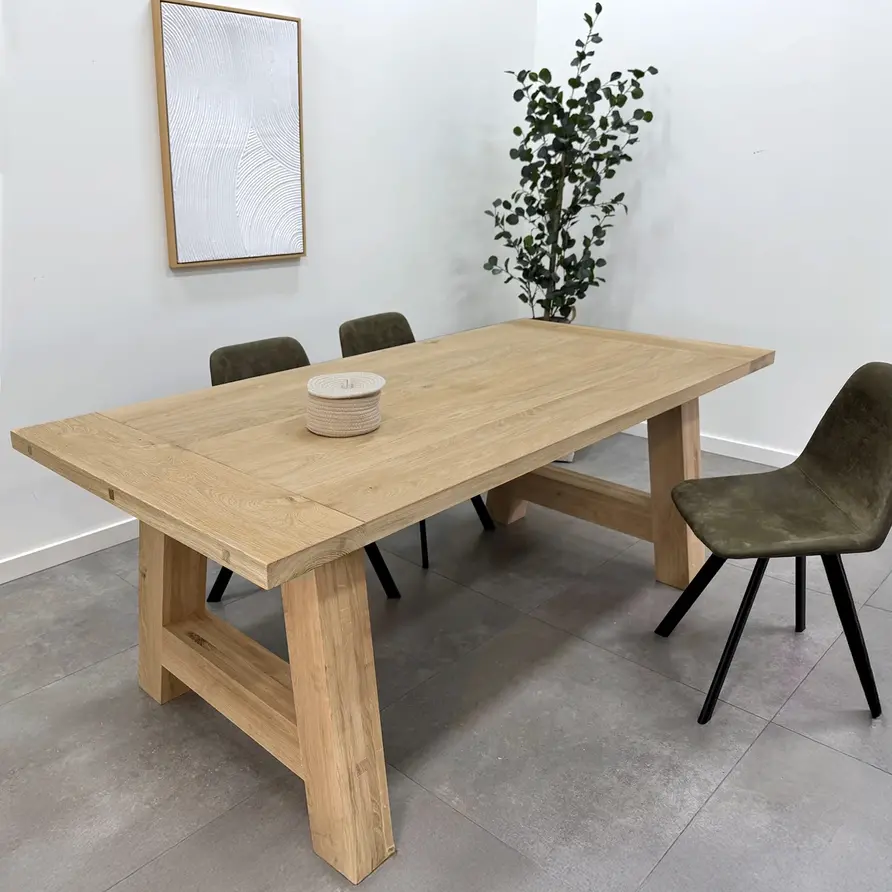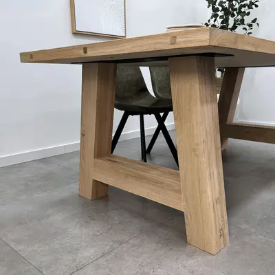 Massief eiken A-poot SET (2 stuks) - 12x12 cm A-tafelpoot - 72 cm hoog - 78 cm breed (breedte van de montageplaat) - 88 cm breed (onderzijde) - onbehandeld rustiek Europees eikenhout - kunstmatig gedroogd (kd) circa 12% -geschaafd & licht opgeborsteld. Een prachtige sfeervol eiken A tafelpoot die zorgvuldig met de hand gemaakt is door vakmannen. Deze bijzondere A poot is vervaardigd uit rustiek Europees eikenhout (bevat noesten, scheurtjes en eventueel scheuren), dat eerst gedroogd wordt tot circa 12%. Het eikenhout wordt vervolgens geschaafd en vervolgens licht (op)geborsteld. Een bijzondere & sfeervolle tafelpoot van eikenhout, voor een bijzondere tafel!