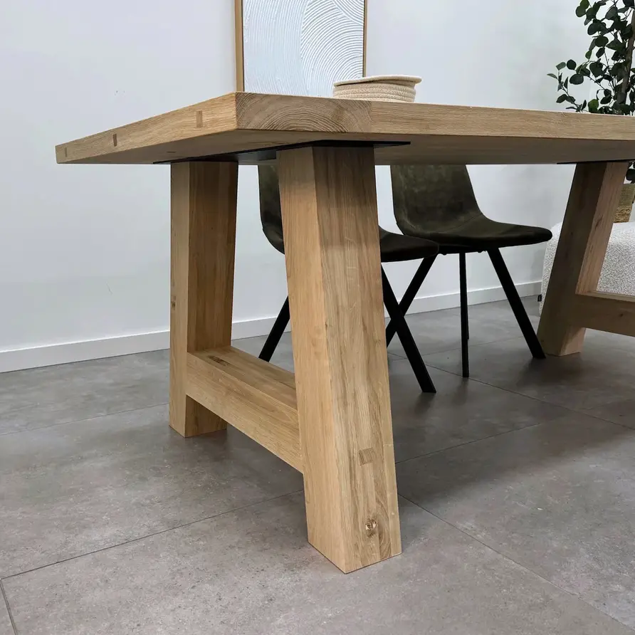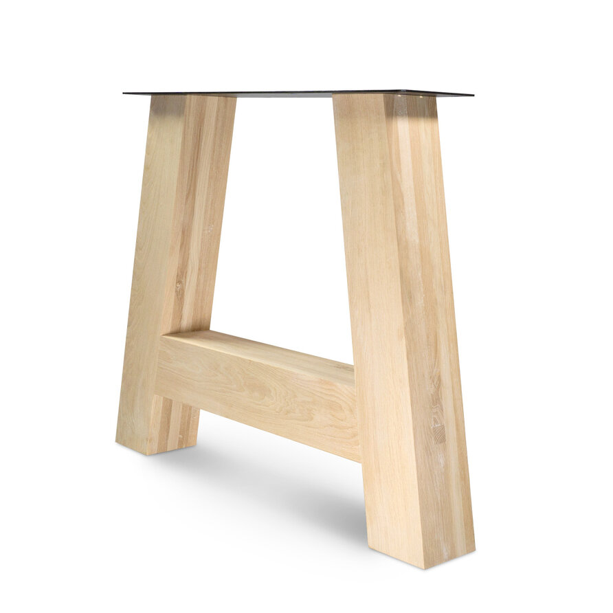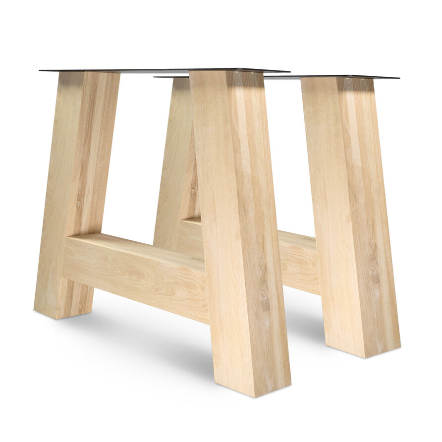 Eiken A-poot SET (2 stuks) 12x12 cm - 72 cm hoog - 78 cm breed (montageplaat) - 88 cm breed (onderzijde) - Rustiek licht geborsteld - A-tafelpoot 12% KD Europees eikenhout