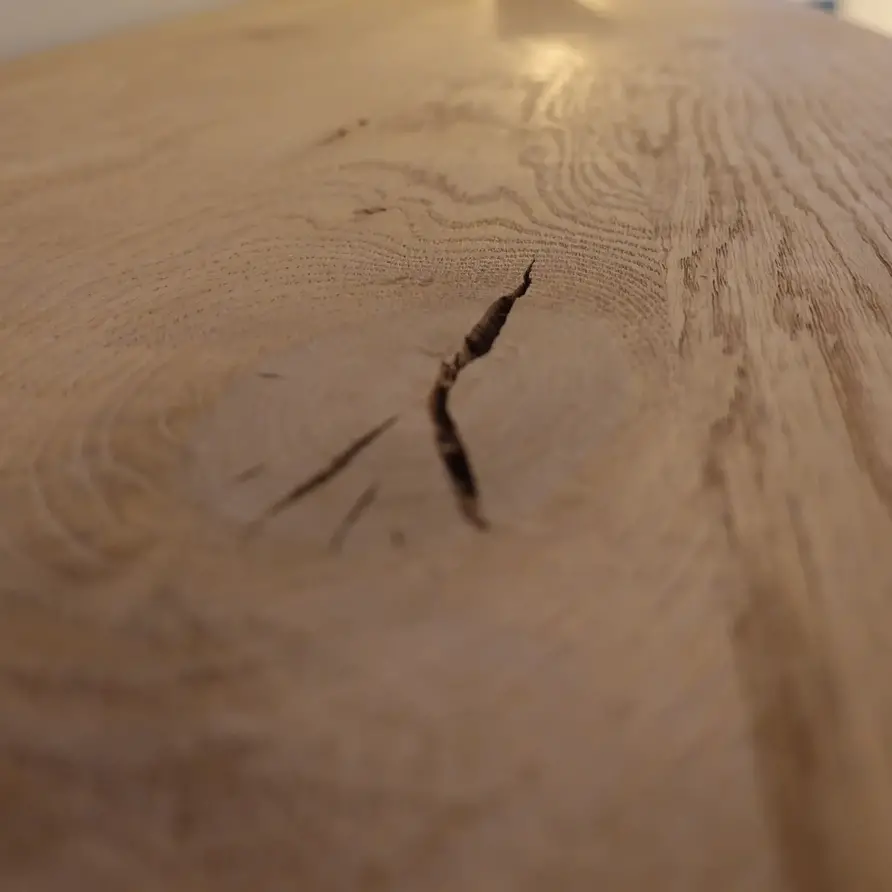 Standaard wordt een rustiek eiken (meubel) paneel onbehandeld geleverd, met open noesten en scheurtjes, scherpe randen en een fijn geschuurde afwerking.