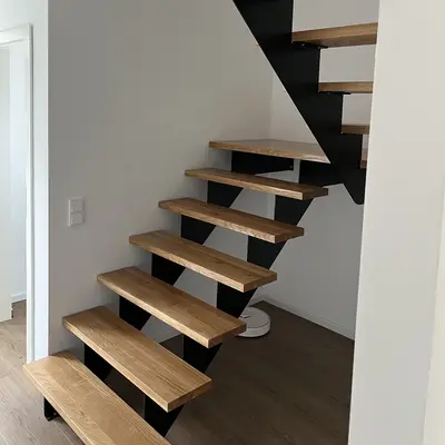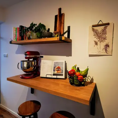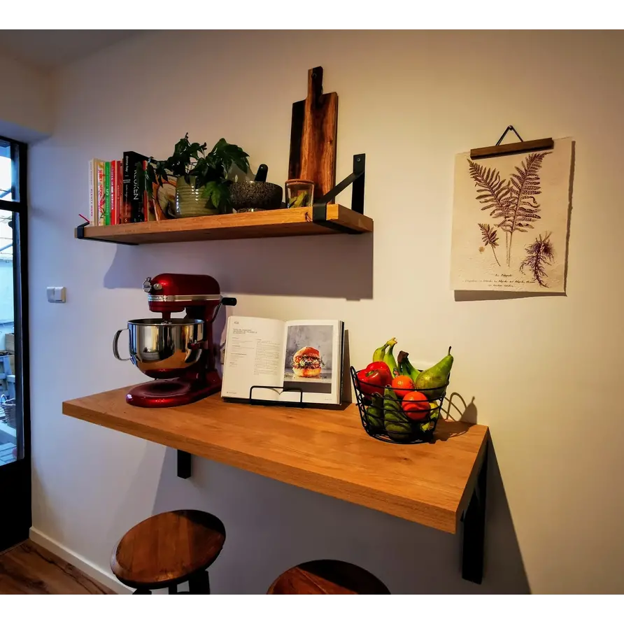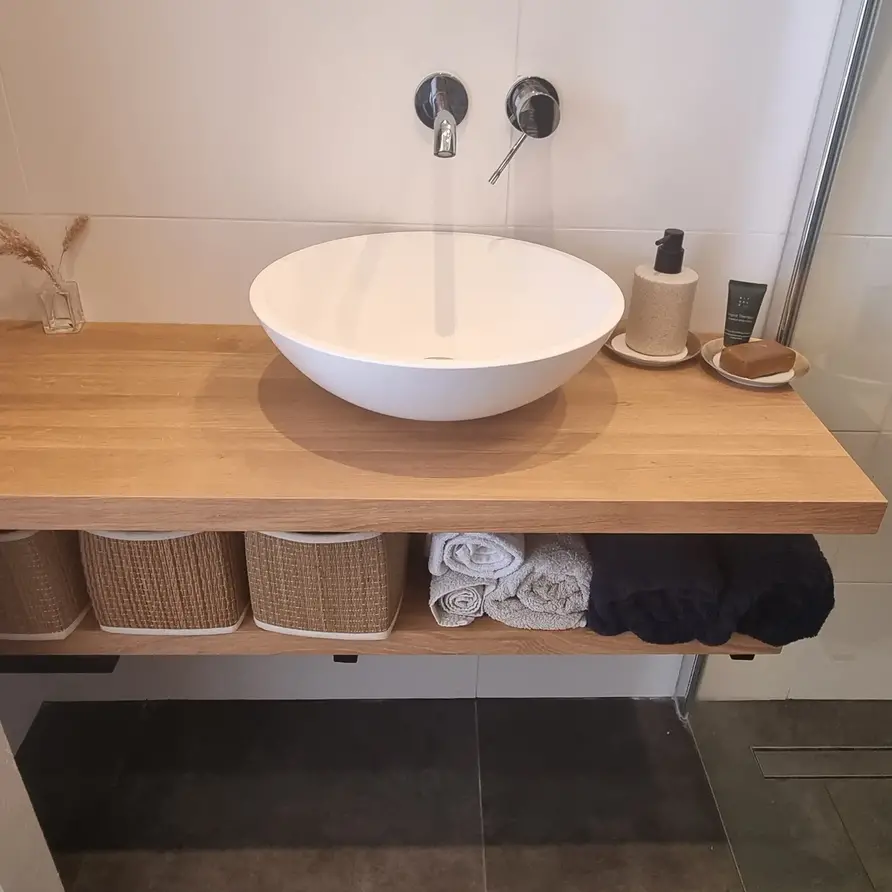 Eiken blad op maat voor binnen. Rustiek eiken KD 8-12% - 4 cm dik - Ambachtelijk verlijmd massief eiken paneel + doorlopende lamellen - Optioneel: noesten gevuld / behandeld (olie/lak) / met tafelblad kanten / met stalen profielen / oppervlak geborsteld. Lees meer