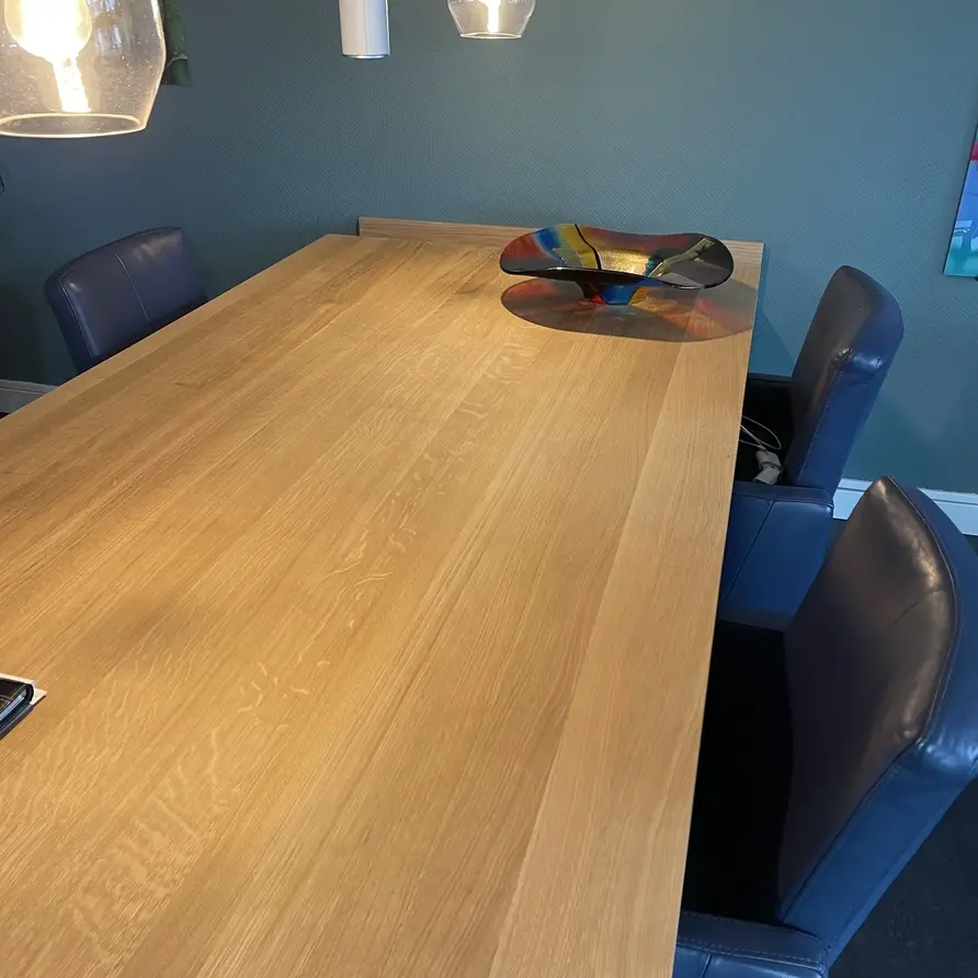 Eiken blad op maat voor binnen. Foutvrij eiken KD 8-12% - 4 cm dik - Ambachtelijk verlijmd massief eiken paneel + doorlopende lamellen - Optioneel: behandeld (olie/lak) / met tafelblad kanten / met stalen profielen / oppervlak geborsteld. Lees meer