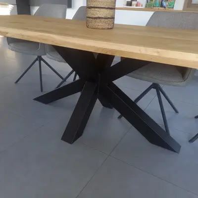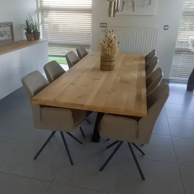 Eiken blad op maat voor binnen. Rustiek eiken KD 8-12% - 4 cm dik - Ambachtelijk verlijmd massief eiken paneel + doorlopende lamellen - Optioneel: noesten gevuld / behandeld (olie/lak) / met tafelblad kanten / met stalen profielen / oppervlak geborsteld. Lees meer