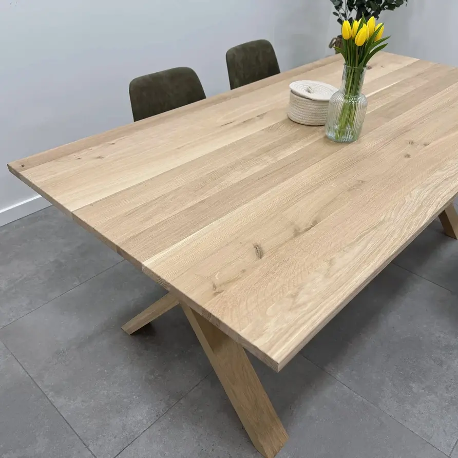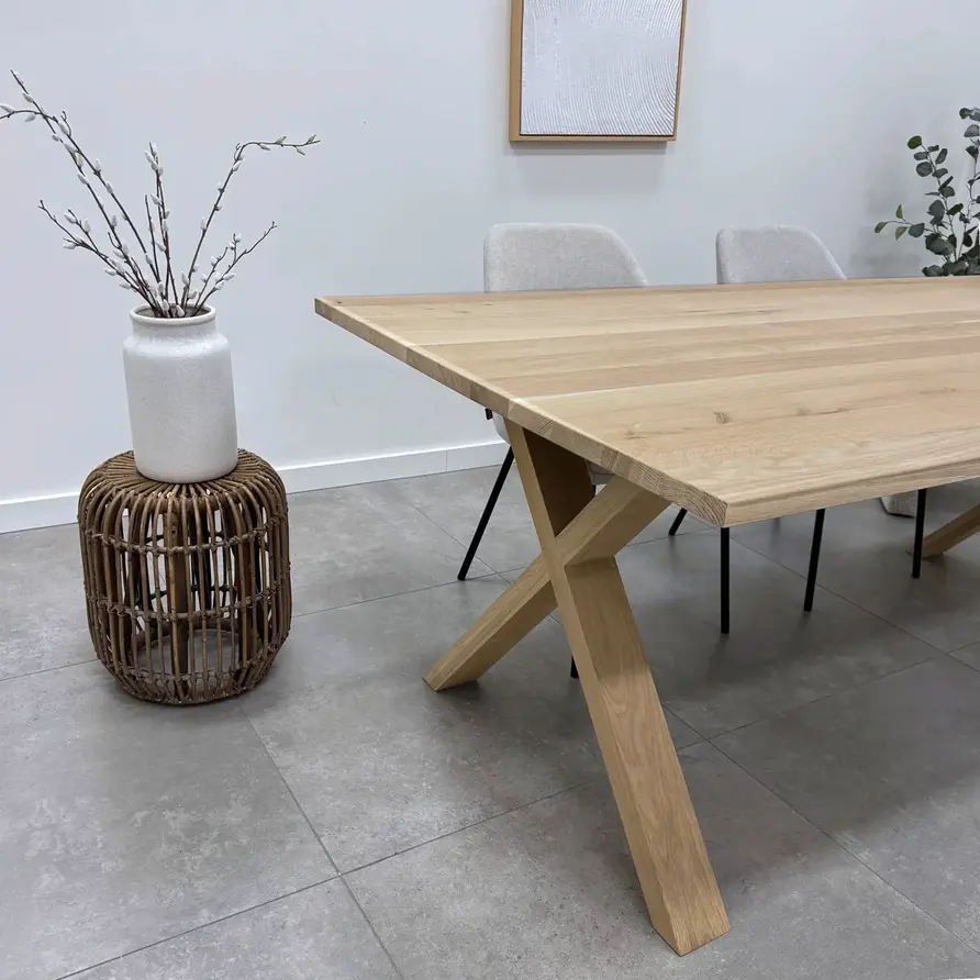 Massief eiken kruispoot SET (2 stuks) - 10x4 cm X-poot - 72 cm hoog - 77 cm breed onderzijde- 78 cm breedte montageplaat - onbehandeld rustiek Europees eikenhout - kunstmatig gedroogd (kd) circa 12% -geschaafd. Een stijlvolle eiken X-tafelpoot die zorgvuldig met de hand gemaakt is door vakmannen. Deze bijzondere kruispoot is vervaardigd uit rustiek Europees eikenhout (bevat kleine noesten & scheurtjes), dat eerst gedroogd wordt tot circa 12%. Het eikenhout wordt vervolgens geschaafd. Een bijzondere A-tafelpoot van eikenhout, voor een bijzondere tafel!