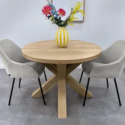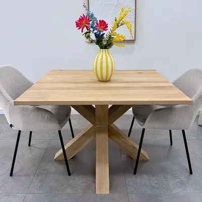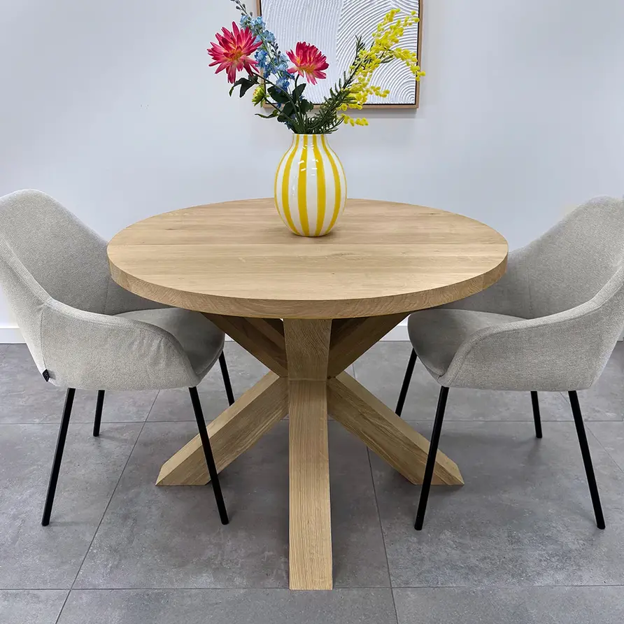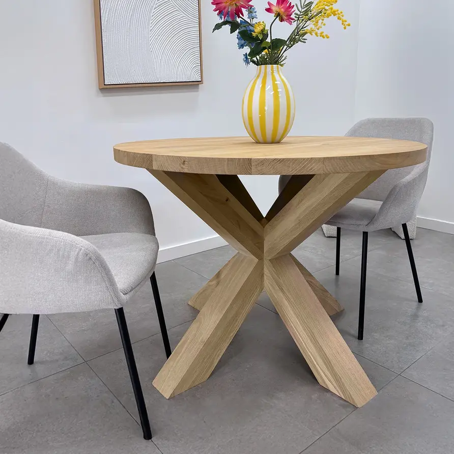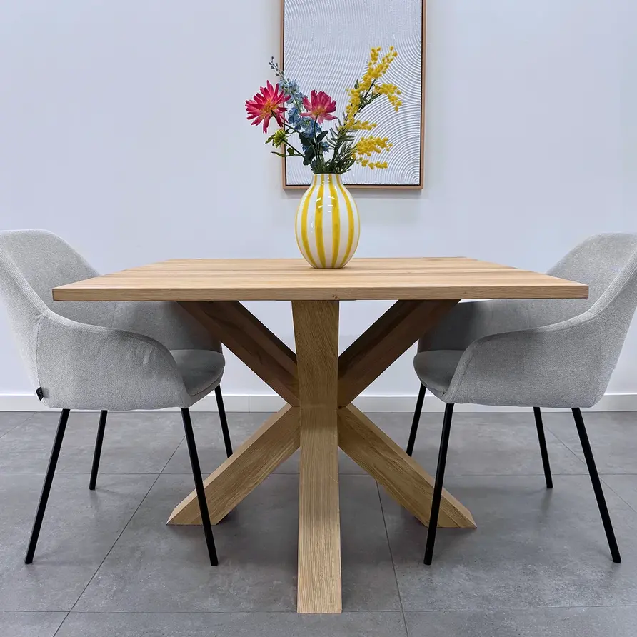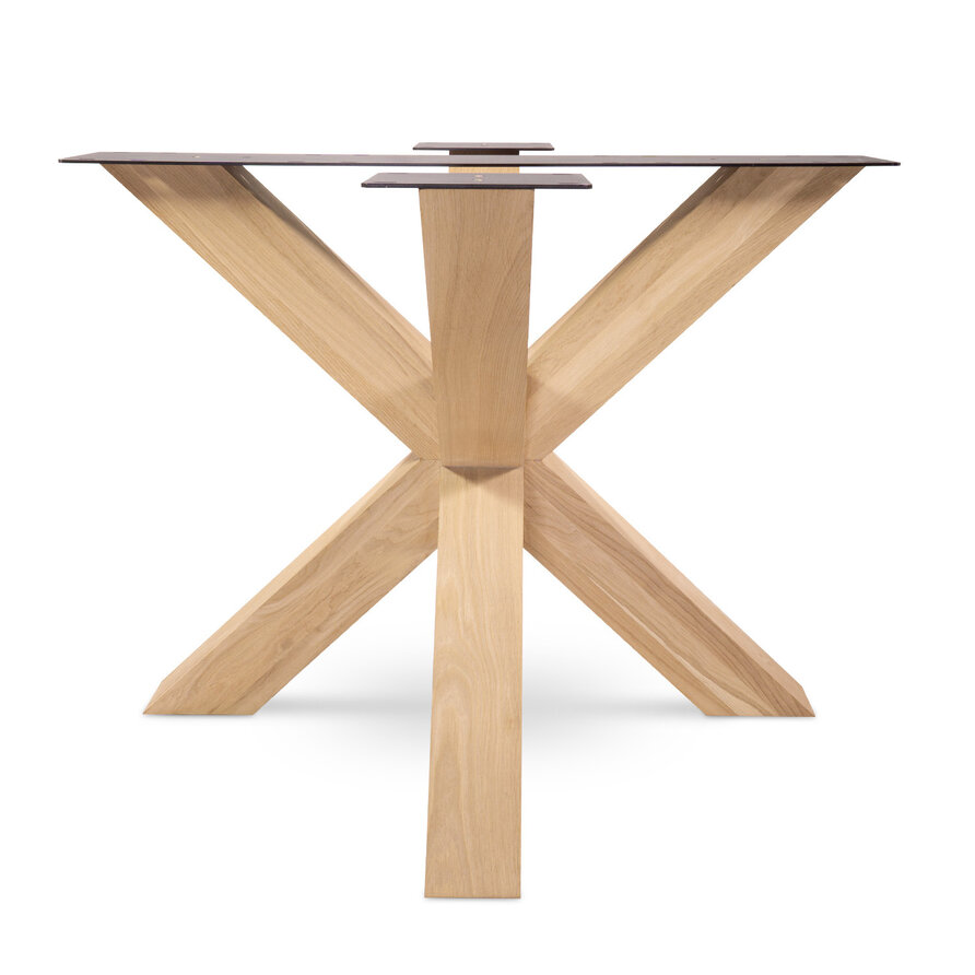 Eiken dubbele kruispoot 10x10 cm - 72 cm hoog - 80x80 cm - Rustiek licht geborsteld - Dubbele X tafelpoot - 12% kd Europees eikenhout bij HOUTvakman.nl! Lees meer