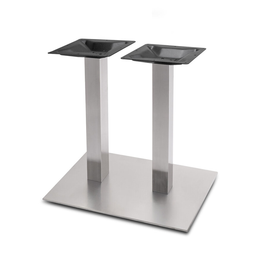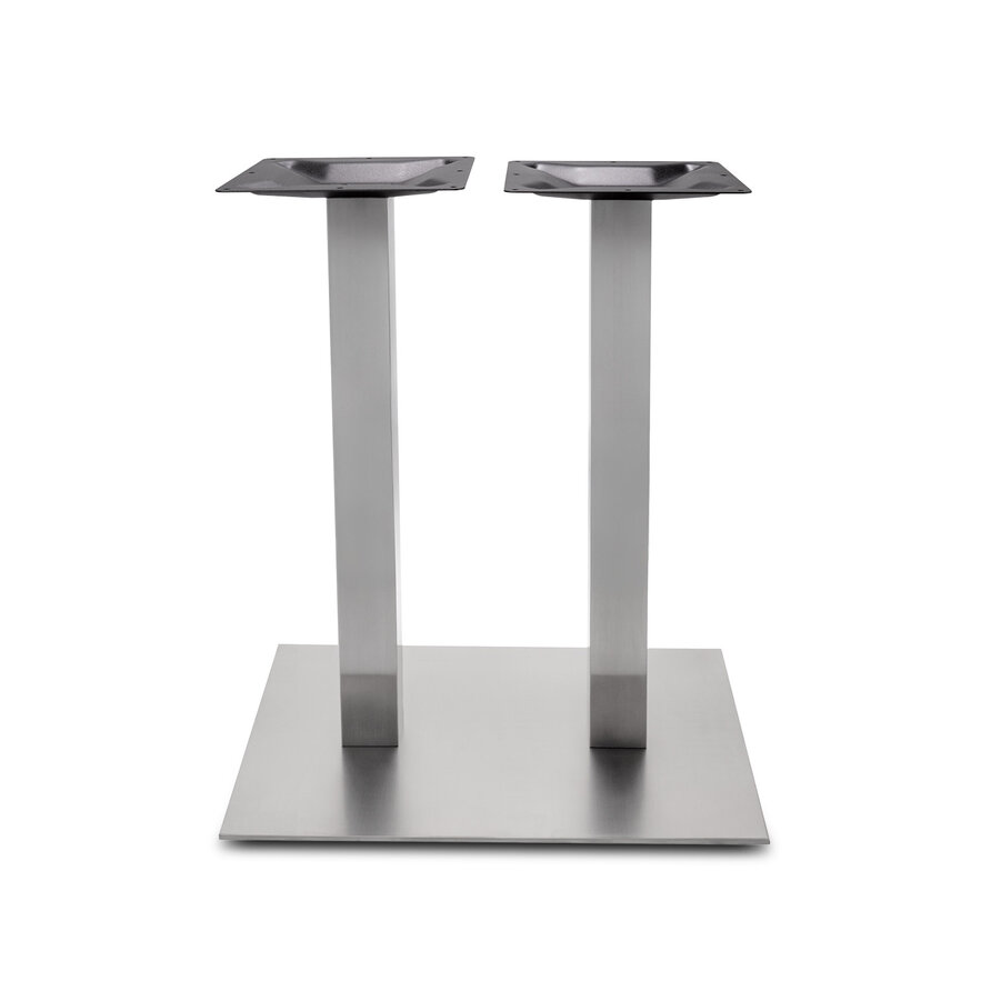 Gietijzeren (horeca)tafel onderstel / tafelpoot op voet - DUO - RVS look - koker vierkant 8x8 cm - hoogte: 72 cm - voetplaat: 40x70 cm - montageplaten bovenzijde (2-stuks): 30x30 cm - Inclusief RVS look poedercoating (glad) - Montageplaat is voorzien van gaten t.b.v. bevestiging. Een bijzondere tafel(tjes) onderstel van gietijzer - op een stevige voetplaat - met een moderne vormgeving. Dit model wordt ook wel een 'horeca / restaurant tafelonderstel' genoemd. Een mooi, stevig & voordelig onderstel met een moderne uitstraling. Dit onderstel van gietijzer is ideaal geschikt voor een vierkant en/of rond tafelblad van eikenhout. Dit gietijzeren onderstel is voorzien van een hoogwaardige RVS kleur poedercoating (glad).