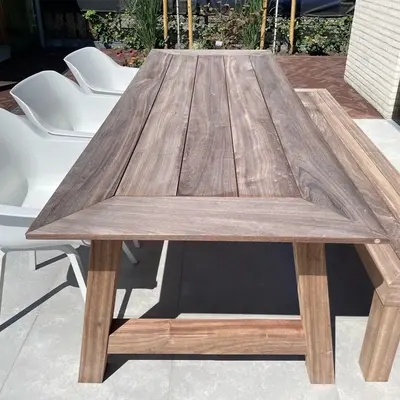 Padoek tuintafel elegant (2,1 cm dik): Een bijzondere buitentafel van luxe padouk hardhout. Deze tuin / buiten (eet)tafel kunt u volledig naar wens configureren. Uw stijlvolle padouk hardhout tafel wordt op maat vervaardigd, met zorg & oog voor detail. Lees meer