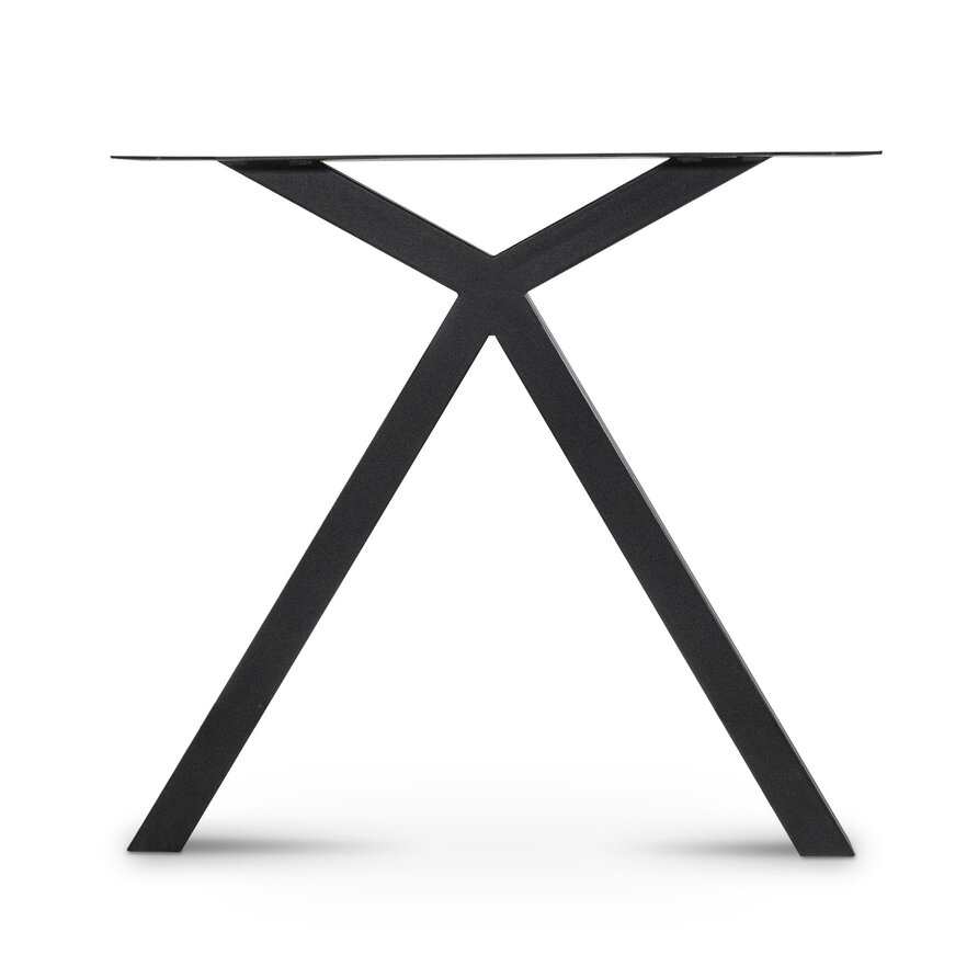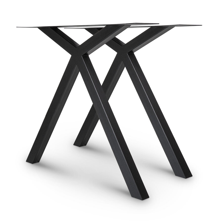 Zwarte X-speciaal poten van metaal - met een (koker)dikte van 5x5 cm, een hoogte van 72 cm en een breedte van 78 cm (montageplaat) - die met de hand worden vervaardigd. De 5x5 cm koker geeft de poot een strak uiterlijk. Met de trendy X-vorm & de stoere matzwarte fijnstructuur poedercoating bent u verzekerd van een stijlvolle metalen tafelpoot.
