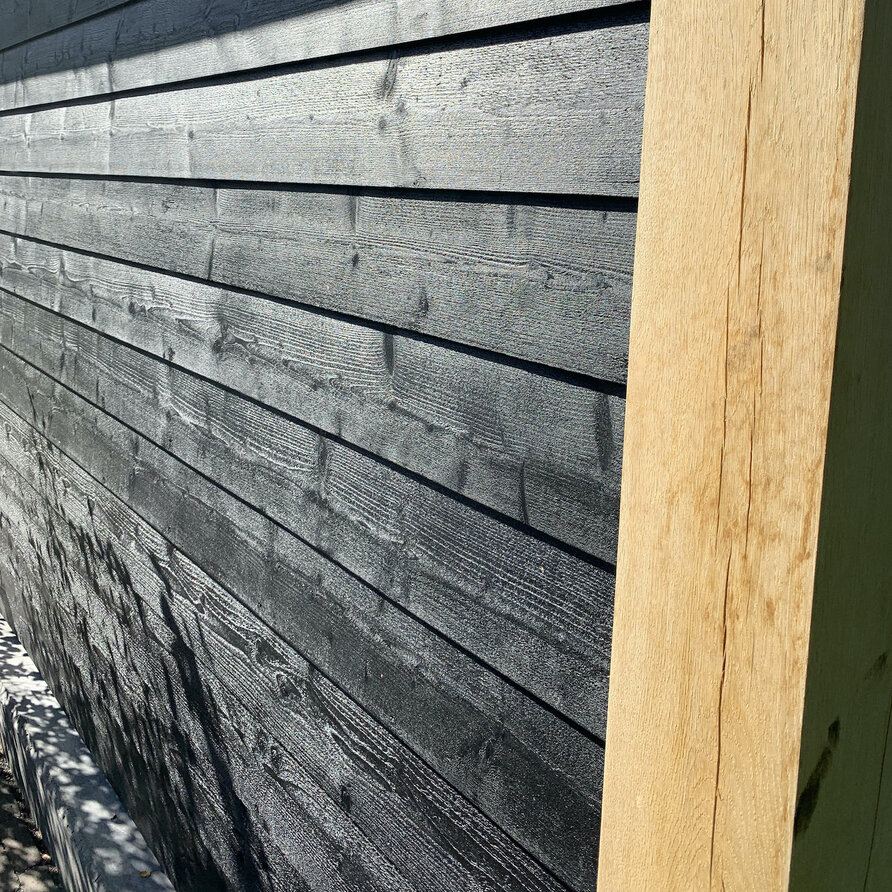 Een eerlijk verhaal - zwart vuren KD profielhout met ruwe zichtzijde voor buiten.