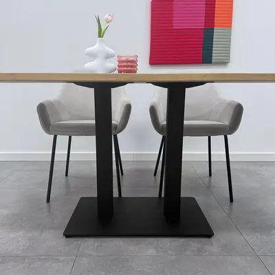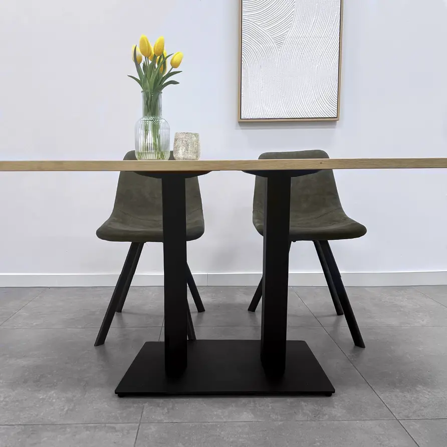 Zwart gietijzer tuin bistro onderstel "duo" met voetrand - 8x8 cm "dik" (kokerafmeting) - 3-delig - 72 cm hoog - afmeting bovenzijde (montageplaten): 30x62 cm - afmeting onderzijde (voetplaat): 40x70 cm - Hoogwaardig verzinkt & gecoat metaal voor buiten - Centraal (horeca) tuintafel tafelonderstel met RAL-9005 fijnstructuur poedercoating. Een sfeervol tuin bistro onderstel van stoer matzwart gecoat gietijzer - in mooie "duo" vorm, speciaal voor rechthoekige tafelbladen - met twee staanders en massieve voetplaat. Deze metalen "centrale bistro tafelpoot" is vervaardigd uit stevig, voordelig & licht gietijzer. Speciaal voor buiten wordt dit "horeca tafelonderstel" eerst verzinkt & vervolgens hoogwaardig gecoat met een kwalitatieve fijnstructuur poedercoating in RAL-9005 (gitzwart). Een stoer & kwalitatief bistro tuintafel onderstel; Voor een stijlvolle look met een modern accent. Dit tafelonderstel wordt in 3 delen geleverd, plus bevestigingsmaterialen (bouten & schroeven).
